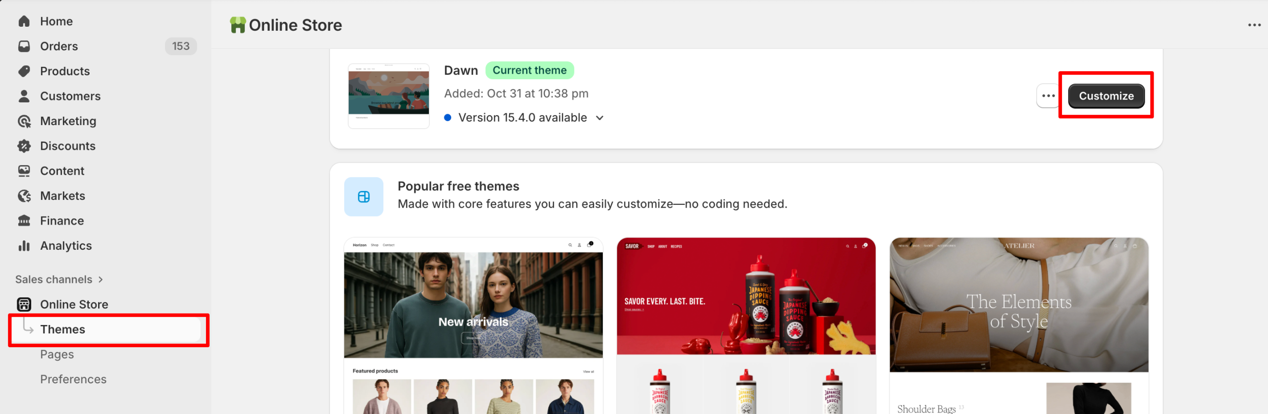 Your Shopify admin also provides theme-level settings that affect technical SEO. Under “Online Store” > “Themes” > “Customize,” you’ll find options to modify header structures, navigation elements, and other components that influence how search engines interpret your site architecture.